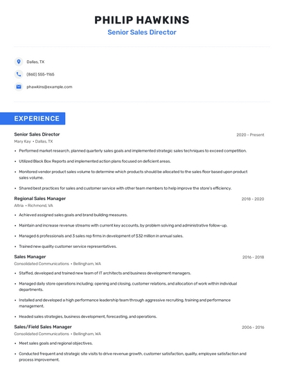 Build a professional senior sales director resume in minutes. Browse through our resume examples to identify the best way to word your resume. Then choose from 5+ resume templates to create your senior sales director resume.