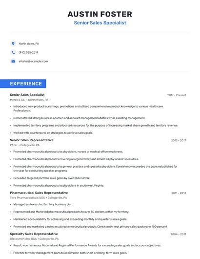 Build a professional senior sales specialist resume in minutes. Browse through our resume examples to identify the best way to word your resume. Then choose from 5+ resume templates to create your senior sales specialist resume.