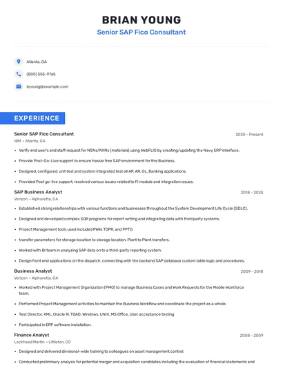 Build a professional senior sap fico consultant resume in minutes. Browse through our resume examples to identify the best way to word your resume. Then choose from 5+ resume templates to create your senior sap fico consultant resume.