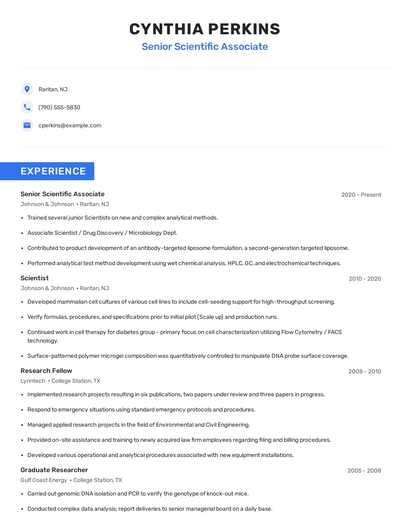 Build a professional senior scientific associate resume in minutes. Browse through our resume examples to identify the best way to word your resume. Then choose from 5+ resume templates to create your senior scientific associate resume.