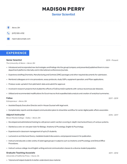 Build a professional senior scientist resume in minutes. Browse through our resume examples to identify the best way to word your resume. Then choose from 5+ resume templates to create your senior scientist resume.
