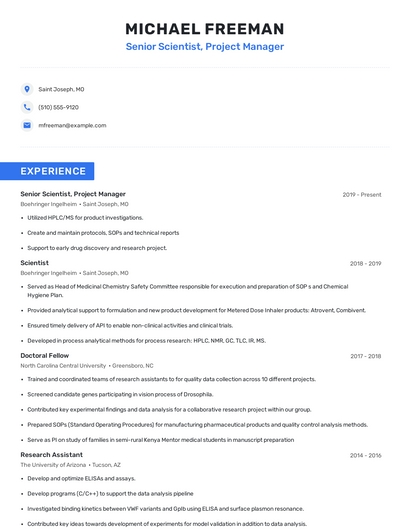 Build a professional senior scientist, project manager resume in minutes. Browse through our resume examples to identify the best way to word your resume. Then choose from 5+ resume templates to create your senior scientist, project manager resume.