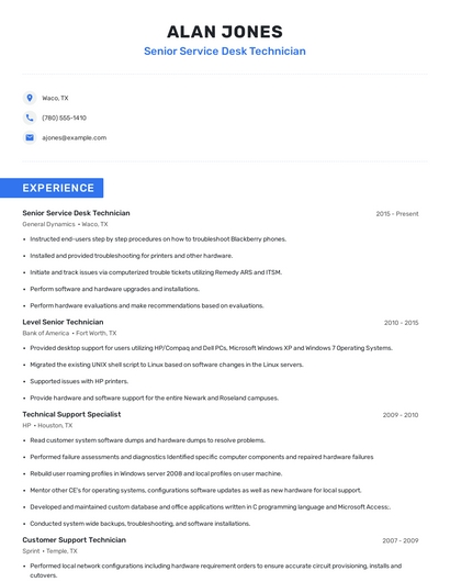 Build a professional senior service desk technician resume in minutes. Browse through our resume examples to identify the best way to word your resume. Then choose from 5+ resume templates to create your senior service desk technician resume.