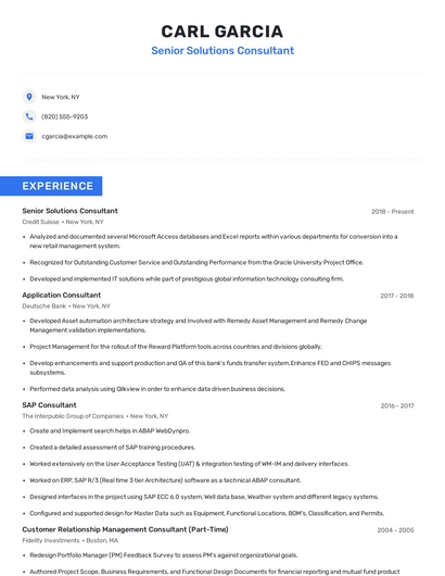 Build a professional senior solutions consultant resume in minutes. Browse through our resume examples to identify the best way to word your resume. Then choose from 5+ resume templates to create your senior solutions consultant resume.