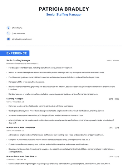 Build a professional senior staffing manager resume in minutes. Browse through our resume examples to identify the best way to word your resume. Then choose from 5+ resume templates to create your senior staffing manager resume.