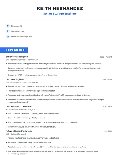 Build a professional senior storage engineer resume in minutes. Browse through our resume examples to identify the best way to word your resume. Then choose from 5+ resume templates to create your senior storage engineer resume.