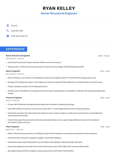 Build a professional senior structural engineer resume in minutes. Browse through our resume examples to identify the best way to word your resume. Then choose from 5+ resume templates to create your senior structural engineer resume.