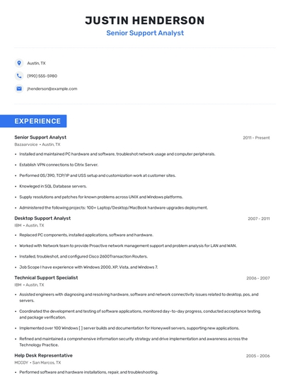 Build a professional senior support analyst resume in minutes. Browse through our resume examples to identify the best way to word your resume. Then choose from 5+ resume templates to create your senior support analyst resume.