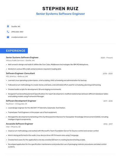 Build a professional senior systems software engineer resume in minutes. Browse through our resume examples to identify the best way to word your resume. Then choose from 5+ resume templates to create your senior systems software engineer resume.