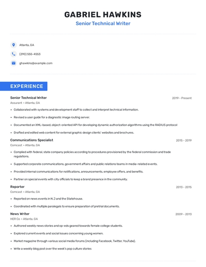 Build a professional senior technical writer resume in minutes. Browse through our resume examples to identify the best way to word your resume. Then choose from 5+ resume templates to create your senior technical writer resume.