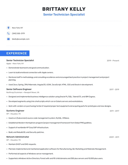 Build a professional senior technician specialist resume in minutes. Browse through our resume examples to identify the best way to word your resume. Then choose from 5+ resume templates to create your senior technician specialist resume.
