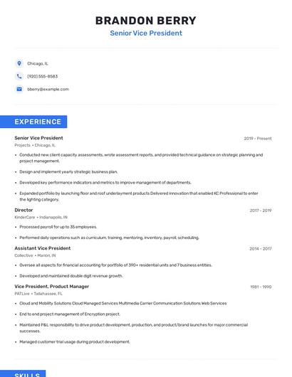Build a professional senior vice president resume in minutes. Browse through our resume examples to identify the best way to word your resume. Then choose from 5+ resume templates to create your senior vice president resume.