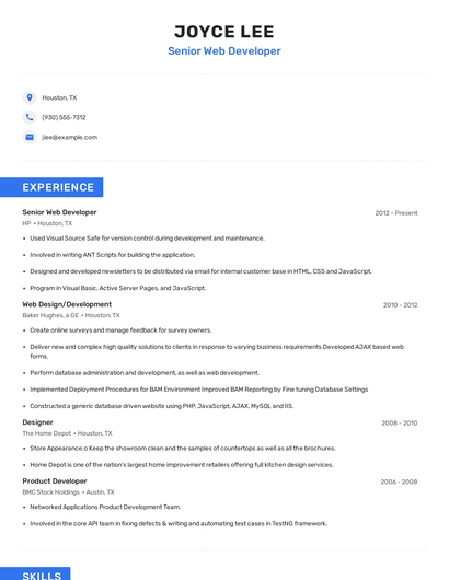 Build a professional senior web developer resume in minutes. Browse through our resume examples to identify the best way to word your resume. Then choose from 5+ resume templates to create your senior web developer resume.