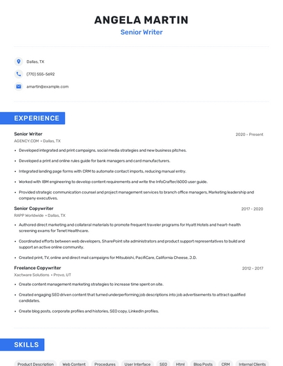 Build a professional senior writer resume in minutes. Browse through our resume examples to identify the best way to word your resume. Then choose from 5+ resume templates to create your senior writer resume.