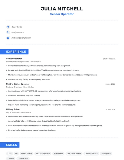 Build a professional sensor operator resume in minutes. Browse through our resume examples to identify the best way to word your resume. Then choose from 5+ resume templates to create your sensor operator resume.
