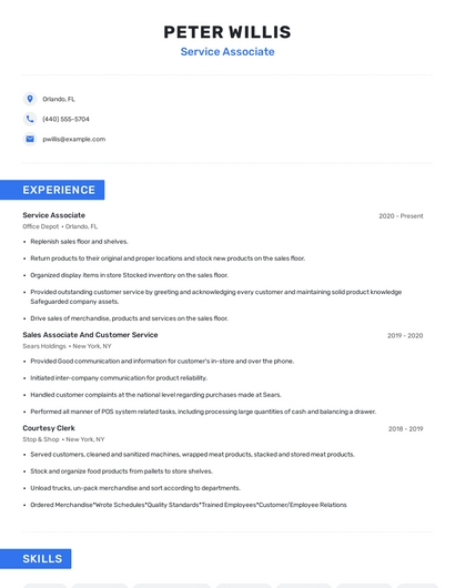 Build a professional service associate resume in minutes. Browse through our resume examples to identify the best way to word your resume. Then choose from 5+ resume templates to create your service associate resume.