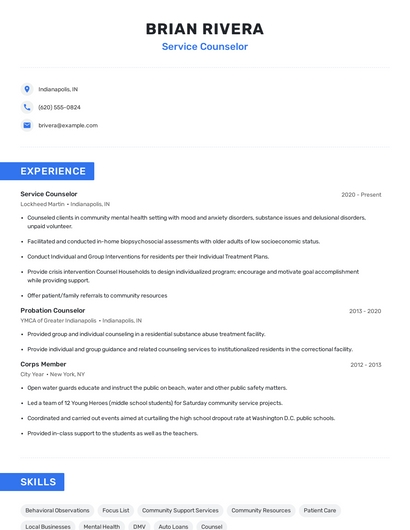 Build a professional service counselor resume in minutes. Browse through our resume examples to identify the best way to word your resume. Then choose from 5+ resume templates to create your service counselor resume.
