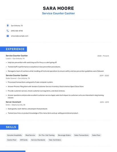 Build a professional service counter cashier resume in minutes. Browse through our resume examples to identify the best way to word your resume. Then choose from 5+ resume templates to create your service counter cashier resume.