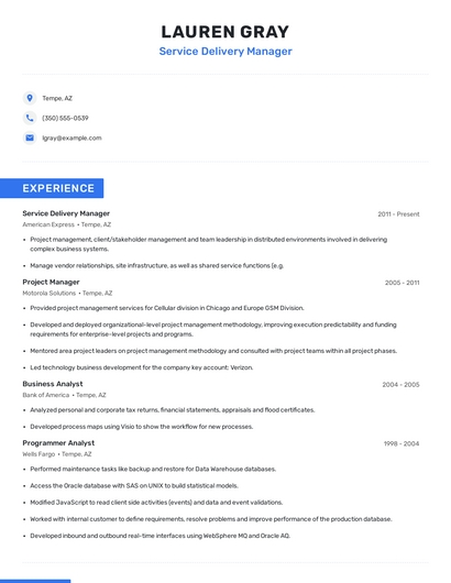 Build a professional service delivery manager resume in minutes. Browse through our resume examples to identify the best way to word your resume. Then choose from 5+ resume templates to create your service delivery manager resume.