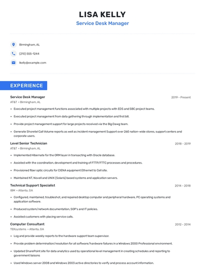 Build a professional service desk manager resume in minutes. Browse through our resume examples to identify the best way to word your resume. Then choose from 5+ resume templates to create your service desk manager resume.