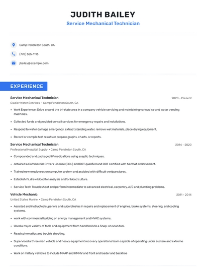 Build a professional service mechanical technician resume in minutes. Browse through our resume examples to identify the best way to word your resume. Then choose from 5+ resume templates to create your service mechanical technician resume.