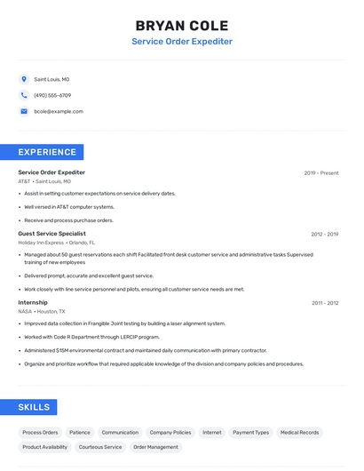 Build a professional service order expediter resume in minutes. Our AI resume writing assistant will guide you through every step of the process, and you can choose from 10+ resume templates to create your service order expediter resume.7. Service Orders