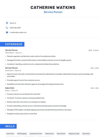 Build a professional service person resume in minutes. Browse through our resume examples to identify the best way to word your resume. Then choose from 5+ resume templates to create your service person resume.