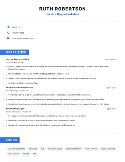 Build a professional service representative resume in minutes. Browse through our resume examples to identify the best way to word your resume. Then choose from 5+ resume templates to create your service representative resume.