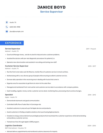 Build a professional service supervisor resume in minutes. Browse through our resume examples to identify the best way to word your resume. Then choose from 5+ resume templates to create your service supervisor resume.