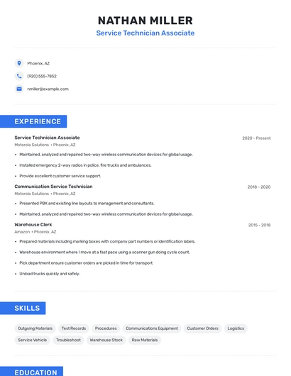 Build a professional service technician associate resume in minutes. Browse through our resume examples to identify the best way to word your resume. Then choose from 5+ resume templates to create your service technician associate resume.