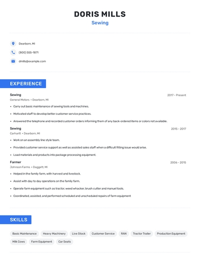 Build a professional sewing resume in minutes. Our AI resume writing assistant will guide you through every step of the process, and you can choose from 10+ resume templates to create your sewing resume.7. Assembly Line