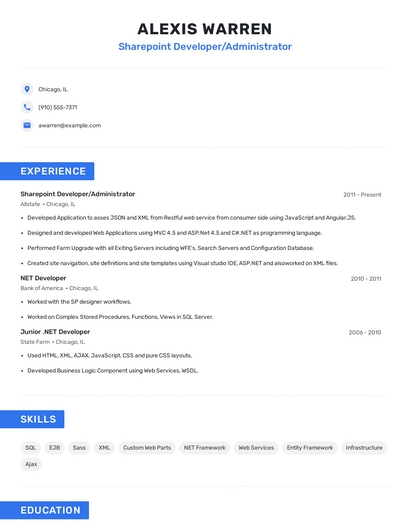 Build a professional sharepoint developer/administrator resume in minutes. Browse through our resume examples to identify the best way to word your resume. Then choose from 5+ resume templates to create your sharepoint developer/administrator resume.