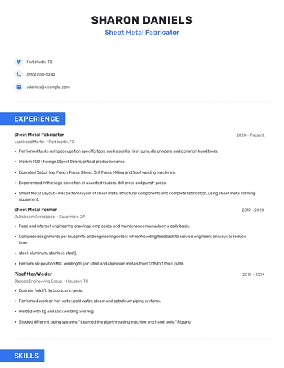 Build a professional sheet metal fabricator resume in minutes. Browse through our resume examples to identify the best way to word your resume. Then choose from 5+ resume templates to create your sheet metal fabricator resume.