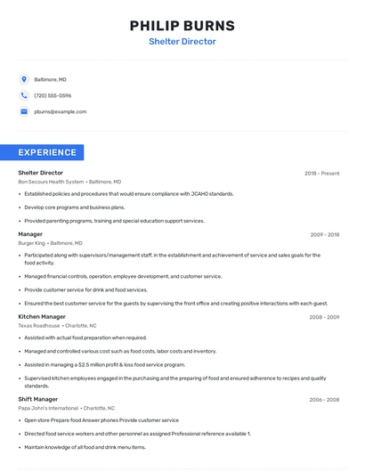 Build a professional shelter director resume in minutes. Browse through our resume examples to identify the best way to word your resume. Then choose from 5+ resume templates to create your shelter director resume.
