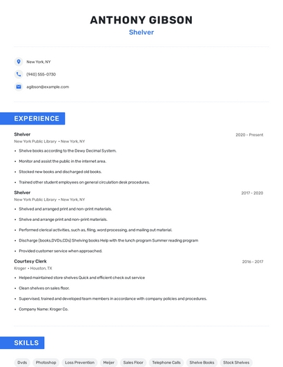 Build a professional shelver resume in minutes. Browse through our resume examples to identify the best way to word your resume. Then choose from 5+ resume templates to create your shelver resume.