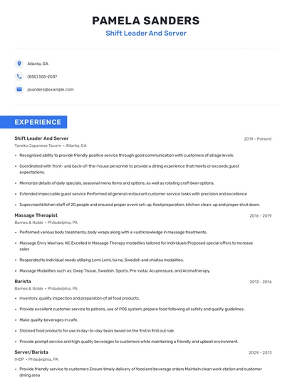 Build a professional shift leader and server resume in minutes. Browse through our resume examples to identify the best way to word your resume. Then choose from 5+ resume templates to create your shift leader and server resume.
