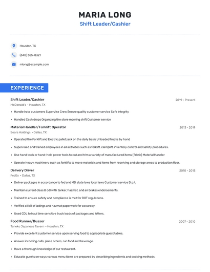 Build a professional shift leader/cashier resume in minutes. Browse through our resume examples to identify the best way to word your resume. Then choose from 5+ resume templates to create your shift leader/cashier resume.
