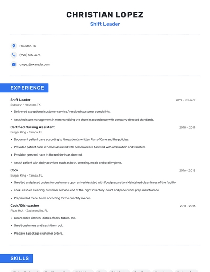 Build a professional shift leader resume in minutes. Browse through our resume examples to identify the best way to word your resume. Then choose from 5+ resume templates to create your shift leader resume.