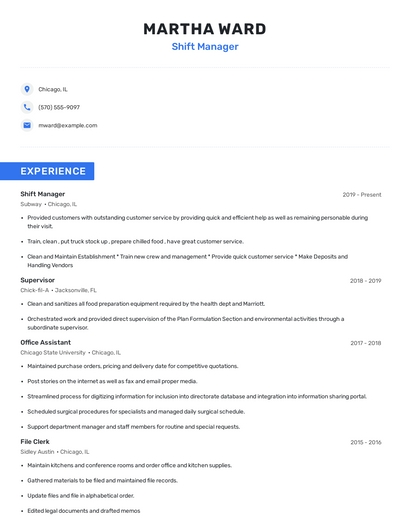 Build a professional shift manager resume in minutes. Browse through our resume examples to identify the best way to word your resume. Then choose from 5+ resume templates to create your shift manager resume.