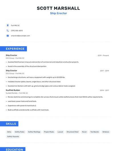 Build a professional ship erector resume in minutes. Browse through our resume examples to identify the best way to word your resume. Then choose from 5+ resume templates to create your ship erector resume.