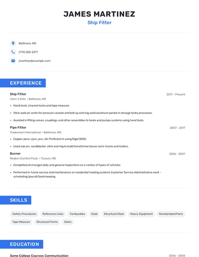 Build a professional ship fitter resume in minutes. Browse through our resume examples to identify the best way to word your resume. Then choose from 5+ resume templates to create your ship fitter resume.