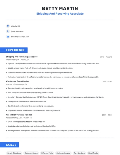 Build a professional shipping and receiving associate resume in minutes. Our AI resume writing assistant will guide you through every step of the process, and you can choose from 10+ resume templates to create your shipping and receiving associate resume.7. RF