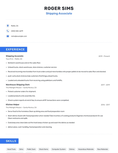 Build a professional shipping associate resume in minutes. Our AI resume writing assistant will guide you through every step of the process, and you can choose from 10+ resume templates to create your shipping associate resume.7. Shipping Receiving