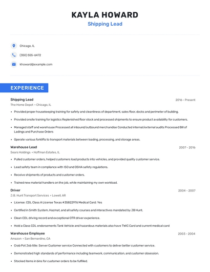 Build a professional shipping lead resume in minutes. Browse through our resume examples to identify the best way to word your resume. Then choose from 5+ resume templates to create your shipping lead resume.