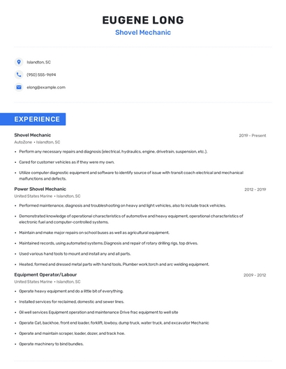Build a professional shovel mechanic resume in minutes. Our AI resume writing assistant will guide you through every step of the process, and you can choose from 10+ resume templates to create your shovel mechanic resume.7. Loaders