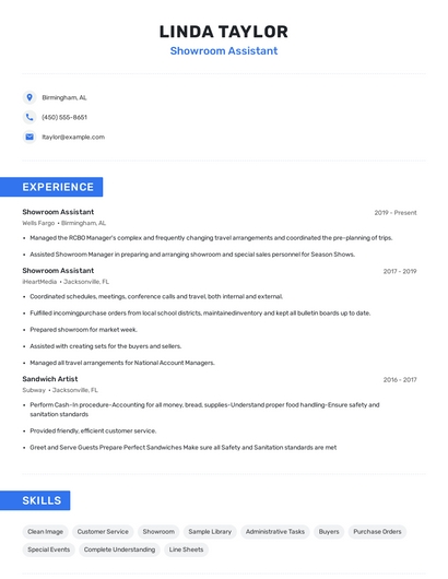 Build a professional showroom assistant resume in minutes. Browse through our resume examples to identify the best way to word your resume. Then choose from 5+ resume templates to create your showroom assistant resume.