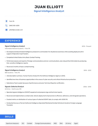Build a professional signal intelligence analyst resume in minutes. Browse through our resume examples to identify the best way to word your resume. Then choose from 5+ resume templates to create your signal intelligence analyst resume.