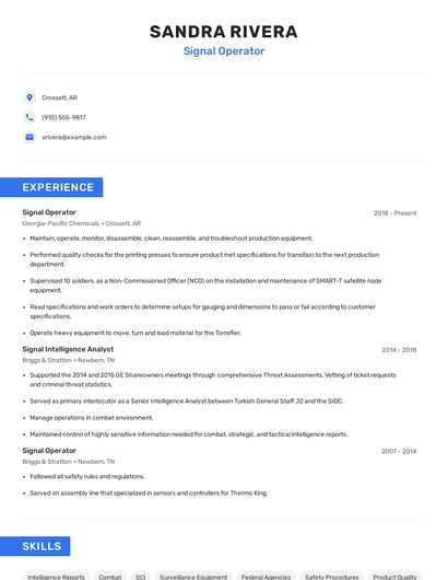 Build a professional signal operator resume in minutes. Our AI resume writing assistant will guide you through every step of the process, and you can choose from 10+ resume templates to create your signal operator resume.7. NSA