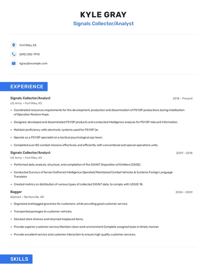 Build a professional signals collector/analyst resume in minutes. Our AI resume writing assistant will guide you through every step of the process, and you can choose from 10+ resume templates to create your signals collector/analyst resume.7. SIGINT
