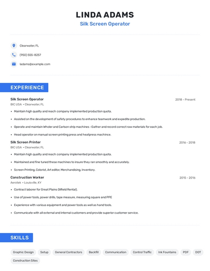 Build a professional silk screen operator resume in minutes. Browse through our resume examples to identify the best way to word your resume. Then choose from 5+ resume templates to create your silk screen operator resume.